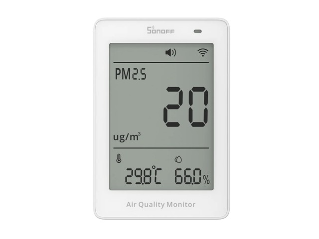 A Matter-Over-Wi-Fi Air Monitor Tracking PM2.5, PM10, Temp, and Humidity. It Features a Real-Time LCD, APP Alerts, and 1-Year Data History for Smart Home Automation. [SONOFF SAWF-07P-AIRGUARD]